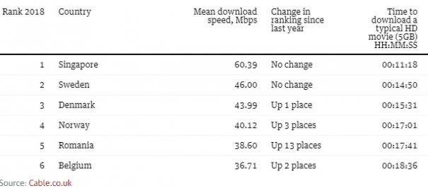 Informaţiile au fost selectate în decurs de 12 luni în 200 de ţări şi regiuni, iar specialiştii au analizat timpul care este necesar descărcării unui film de cinci gigabyte la viteza medie de conexiune la internet din fiecare ţară.RADOR
