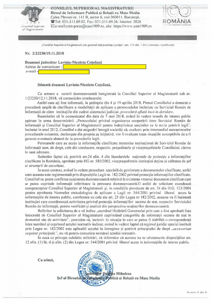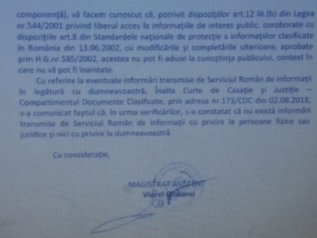 V-am solicitat să-mi comunicați măsurile luate de dumneavoastră pentru clarificarea modului în care au funcționat Protocoalele încheiate între Serviciul Român de Informații și instituția pe care o conduceți, Înalta Curte de Casație și Justiție, inclusiv în legătură cu fluxul de informații care a avut loc între cele două instituții anterior menționate.