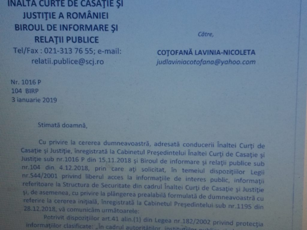 Astfel, pe data de 03 ianuarie 2019, stimata unealta a SRI ii comunica judecatoarei Cotofana urmatoarele: