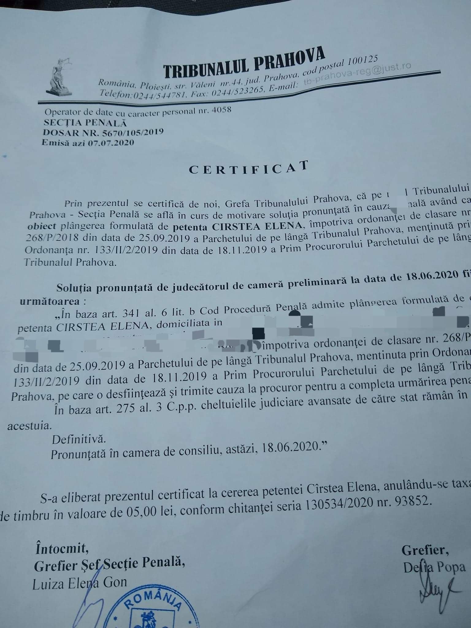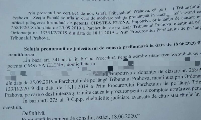 Roxana Cîrstea nu a renunțat și a apelat la instanță. Astfel, judecătorul de cameră preliminară de la Tribunalul Prahova, luând act de cele prezentate ca probe, a decis în data de 07.06.2019 să accepte plângerea și să întoarcă dosarul la procuror pentru a completa urmărirea penală.