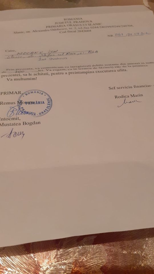 Ajunge maica-mi acasă, o înștiințare de la primăria Slănic ,unde ,unchiului meu Ion Mocanu,i se cere să plătească o amendă de 100 de lei ,în termen de 5 zile pentru a evita „executarea forțată „.