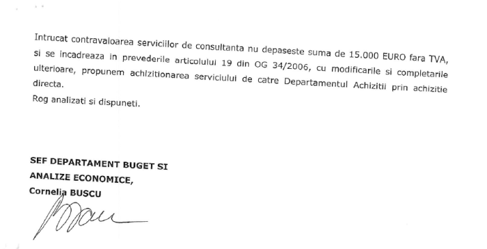 Așadar, în 20 ianuarie 2010, șefa departamentului ,,analize economice” din Poșta Română se trezește brusc dimineața și își definește nevoia (imediat aprobată de Tudor Bohâlțeanu) de ,,cercetare documentată științific” privind ,,Sistemul de indicatori pentru analiza performanțelor economico-financiare ale Companiei Naționale Poșta Română”. Mai sus, vedeți nota de fundamentare și inexplicabila evaluare a unui contract de consultanță de ,,aproximativ 10.500 de Euro fără TVA” pentru asta.