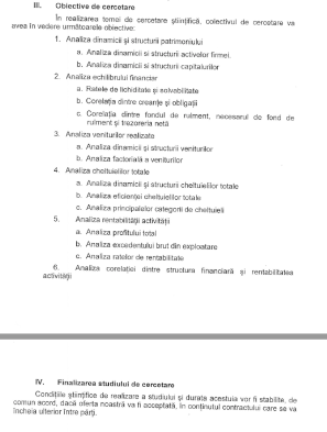Așa cum se observă din obiectul contractului, tema de cercetare a fost analiza dinamicii și structurii activelor Poștei Române, analiza dinamicii și structurii capitalurilor, analiza corelației dintre structuri și capitaluri, analiza veniturilor realizate și analiza rentabilității activității, adică o simplă folosire, în dinamică, a indicatorilor pe care deja Poșta Română îi avea, și mai mult, trebuiau deja analizați de propriul deparament de ,,bugete și analize economice”.