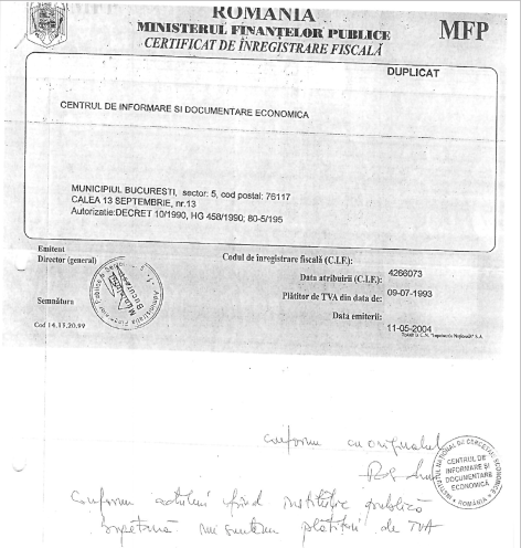 10.500 (zece mii cinci sute) Euro fără TVA, înseamna FIX 10.500 de Euro, întrucât Centrul de Informare și Documentare economică nu era plătitor de TVA și nu putea emite facturi cu TVA. Centrul, cu aceeași adresă ca și fundația ,,Tinerii schimbă România” (Marcu, Franc, Bohâlțeanu) a obținut Codul de Identificare Fiscală în 9 iulie 1993, dar nu a fost niciodată plătitor de TVA, fiind instituție publică, acest lucru fiind atestat chiar de către ei.