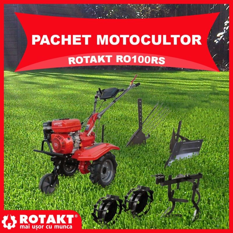 Motocultorul Rotakt RO100RS funcționează cu benzină, având un motor puternic de 7 CP. Cu o fiabilitate ridicată, motorul este un model nou și inovativ, are un consum redus și noxe scăzute. Deține o cutie de viteze cu priză de putere, carcasă reductor din fontă (factor care oferă motocultorului o greutate și o stabilitate mai mare și o rezistență ridicată, putând astfel să fie folosit și în condiții dificile), este dotat cu roți de cauciuc mari (4.00-8) și freze segmentabile și detașabile cu 4 rânduri de cuțite.