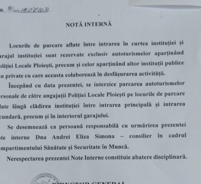 Directorul Albu Catalin (de la Politia Locala Ploiesti) emite abuziv „Note Interne”, fara valoare juridica, doar pentru hartuirea si provocarea politistului care l-a dat pe mana procurorilor
