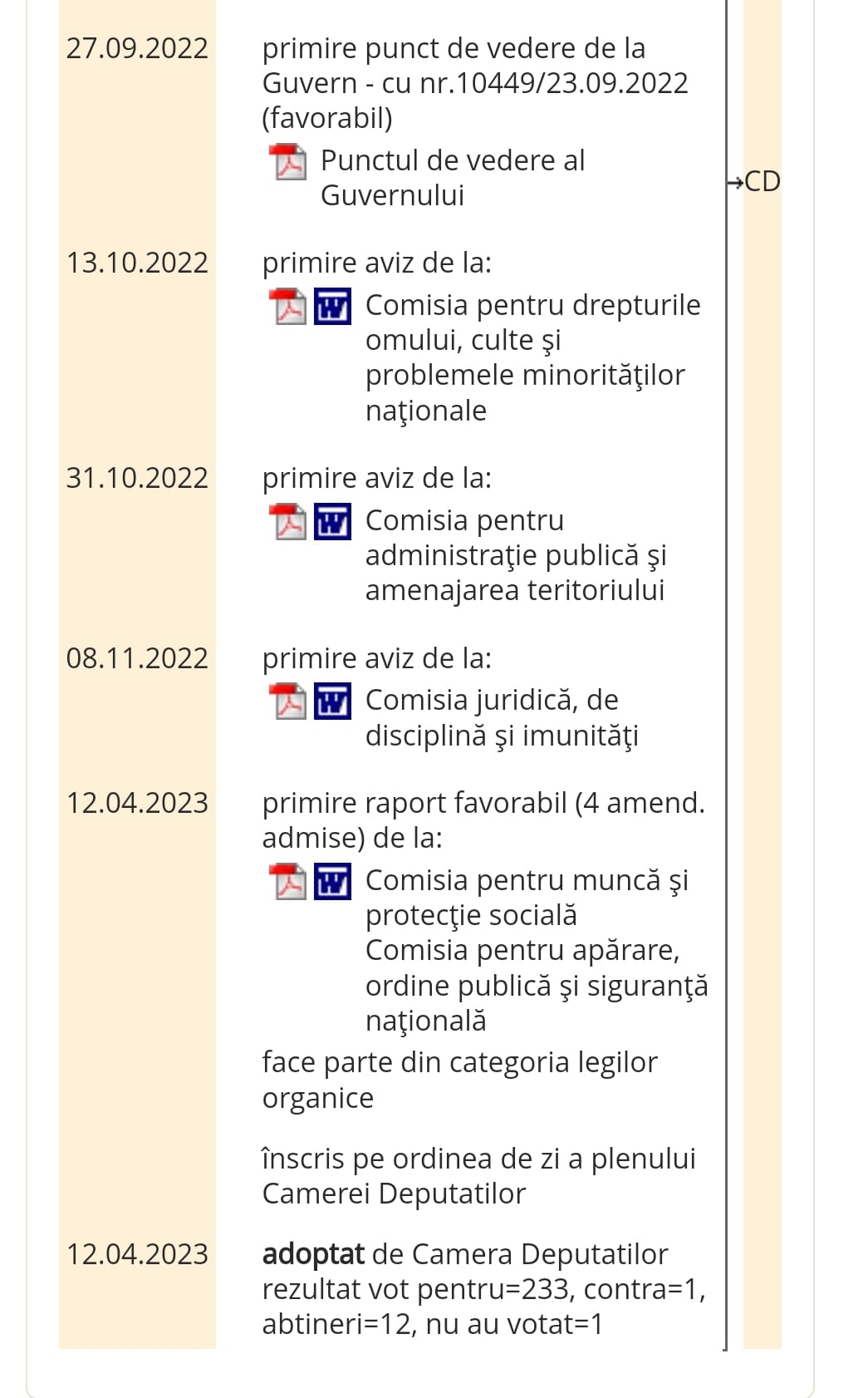 Camera Deputaților a adoptat ieri proiectul de lege pentru modificarea Legii nr 360/2002 privind Statutul polițistului, în ceea ce privește modalitatea de acordare a compensației de chirie. Actul normativ a fost adoptat cu 233 voturi pentru, 1 vot împotrivă și 12 abțineri, urmând să fie trimis președintelui României pentru promulgare, care are ca termen 20 de zile de la primirea acestuia.