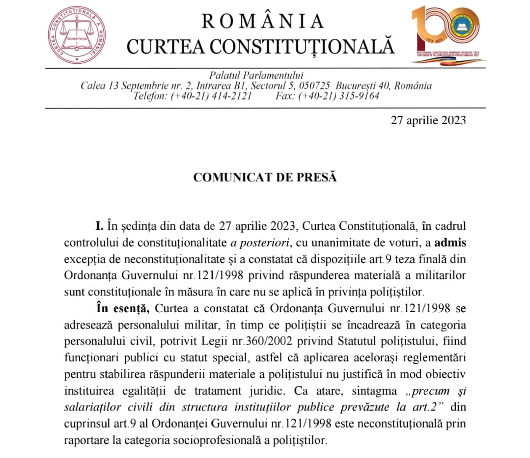 Curtea a constatat că Ordonanța Guvernului nr.121/1998 se adresează personalului militar, în timp ce polițiștii se încadrează în categoria personalului civil, potrivit Legii nr.360/2002 privind Statutul polițistului, fiind funcționari publici cu statut special, astfel că aplicarea acelorași reglementări pentru stabilirea răspunderii materiale a polițistului nu justifică în mod obiectiv instituirea egalității de tratament juridic. Ca atare, sintagma „precum şi salariaților civili din structura instituțiilor publice prevăzute la art.2” din cuprinsul art.9 al Ordonanței Guvernului nr.121/1998 este neconstituțională prin raportare la categoria socioprofesională a polițiștilor.