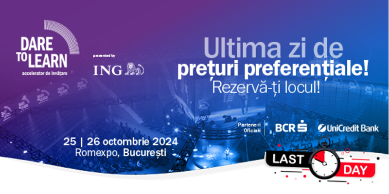 București, 30 aprilie 2024 – Astăzi este ultima zi în care personalul din sistemul de învățământ preuniversitar și universitar din România beneficiază de tarife preferențiale la Dare to Learn – cel mai mare eveniment educațional din Europa, ce va avea loc în 25 și 26 octombrie a.c., la București.  Începând cu mâine, 1 mai a.c., locurile vor fi disponibile și publicului larg (altor categorii profesionale).