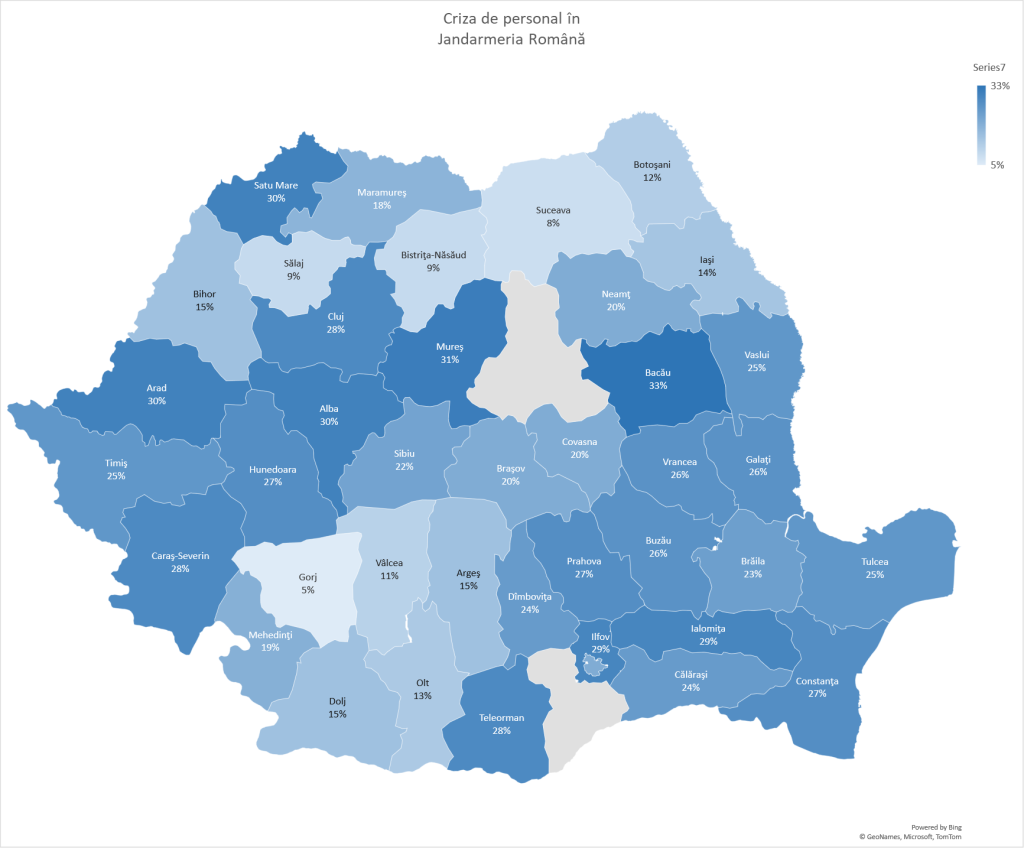 În ceea ce privește criza de personal, putem observa că județele din nordul țării cu Bihor și județele din Oltenia stau ceva mai bine, în schimb, marea majoritate a depășit 20% și tinde spre 30%. Cu unele excepții, putem conchide că cele mai masive ieșiri din sistem s-au produs în județele cele mai înstărite, acolo unde sunt mereu alternative mult mai atrăgătoare, comparativ cu balanța restricțiilor și veniturilor unui jandarm.