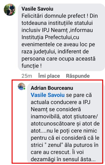 De ce era necesar să fie informat de către Poliție când deja avea raportul de la Inspectoratul pentru Situații de Urgență? Nu cumva situația arată orgoliul unui șoarece care a fost lăsat să preia rolul unui leu și acum așteaptă să fie tratat conform propriilor sale dorințe? Este posibil să fie supărat că gestul său de apreciere către Ministerul Afacerilor Interne, făcut pe pagina sa de Facebook, nu a fost răsplătit cu recunoștință din partea conducerii IPJ Neamț?