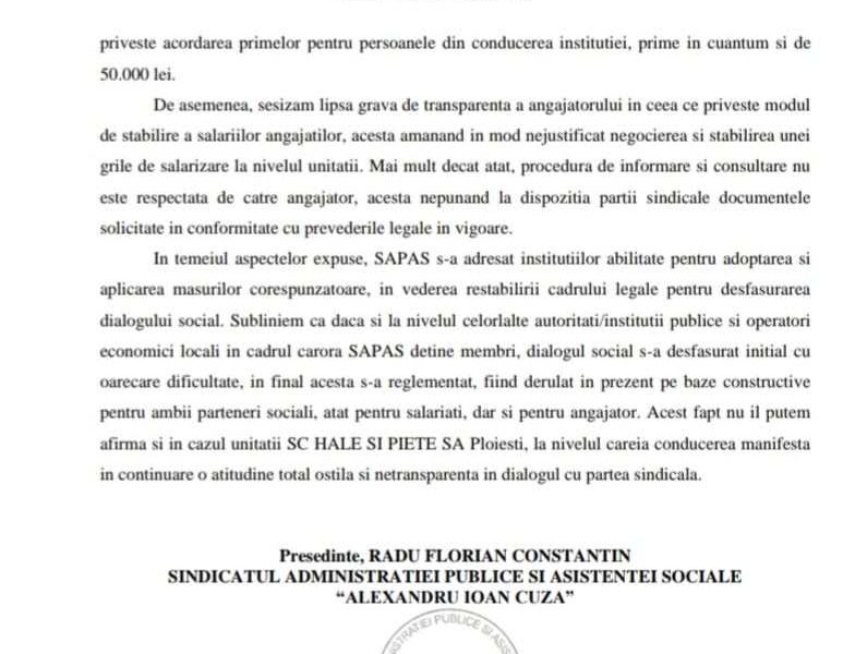 Sindicatul Administrației Publice și Asistenței Sociale „Alexandru Ioan Cuza” (SAPAS), reprezentat legal de către Președinte – domnul Radu Florian Constantin, afiliat la Federația Publisind, reprezentată legal de Președinte – domnul Teoroc Stefan, organizație sindicală reprezentativă la nivelul SC Hale și Piețe SA Ploiești, prin încheierea civilă nr. 93/17.01.2024 pronunțată de Judecătoria Ploiești, sesizează încă o dată lipsa gravă de transparență a conducerii acestei instituții, atât în ceea ce privește modul de administrare și de întrebuințare a resurselor financiare, cât și în ceea ce privește modul de stabilire a salariilor angajaților.